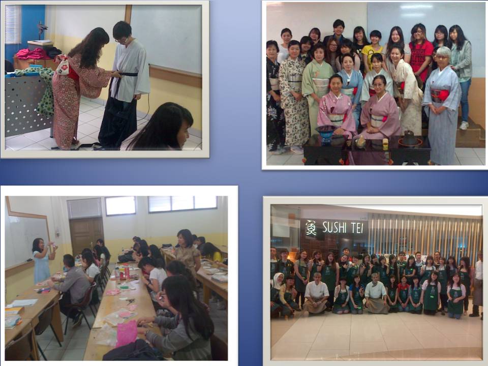 Tahun ini, mahasiswa berkesempatan mendapat 7 pembicara dari luar. Mereka dipilih karena ekspertis di bidangnya. Bahkan untuk materi praktek memasak (ryouri) diadakan langsung di Resto Jepang dengan chef asli lho 😀 berikut potongan puzles gambar-gambar pelaksanaan mata kuliah Bunka Taiken.
