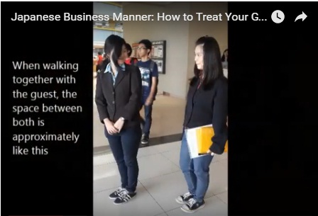 Dalam video ini menceritakan mengenai tata cara menerima tamu dari penyambutan, sampai dengan tamu tersebut selesai berkunjung. Dalam budaya kerja Jepang, Jepang memiliki cara khusus dalam menerima tamu. Untuk lebih jelasnya, silakan saksikan dalam video berikut ini