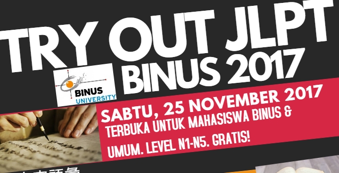 Dibuka pendaftaran untuk Tryout JLPT Binus tahun 2017. Untuk keterangan lebih lanjut silakan membaca E-flyer dan QR code pada E-flyer tersebut. Kegiatan ini bersifat Mandatory pada event Binus Festival untuk mahasiswa Binus Sastra Jepang semua angkatan. Diwajibkan mendaftar terlebih dahulu sebelum datang mengikuti ujian. BATAS AKHIR PENDAFTARAN pada Selasa 21 November 2017. Peserta yang tidak mendaftar s/d batas deadline tidak diperkenankan mengikuti Tryout pada hari H. Silakan isi link pendaftara berikut :